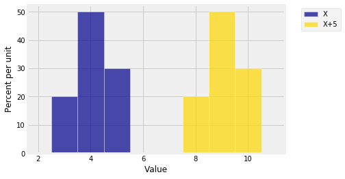 The SD is a measure of spread. It’s natural to want measures of spread to remain unchanged if we just shift a probability histogram to the left or right. Such a shift occurs when we add a constant to a random variable. The figure below shows the distribution of the same $X$ as above, along with the distribution of $X+5$. It is clear that $X+5$ should have the same SD as $X$.